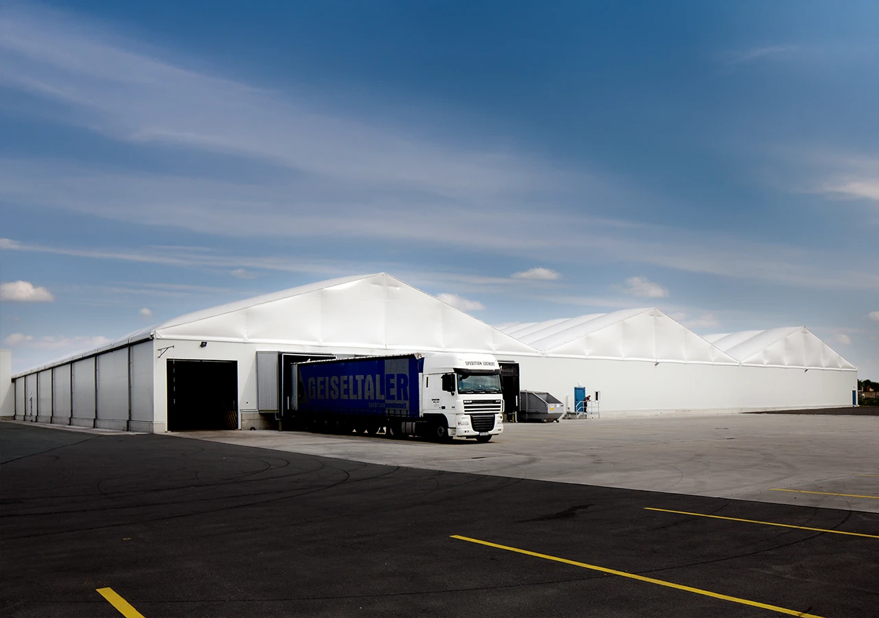 Constructed at the Franken Brunnen, Germany facility, this project comprises three adjacent H-Line series tent systems measuring 30x90x5.2 meters, designed to create a comprehensive industrial warehouse. The structure is equipped with operational features such as loading ramps and optimized for high-volume product management. Following installation, the structure was extended by an additional 30 meters to accommodate growing needs, demonstrating the project's flexible expansion capacity.