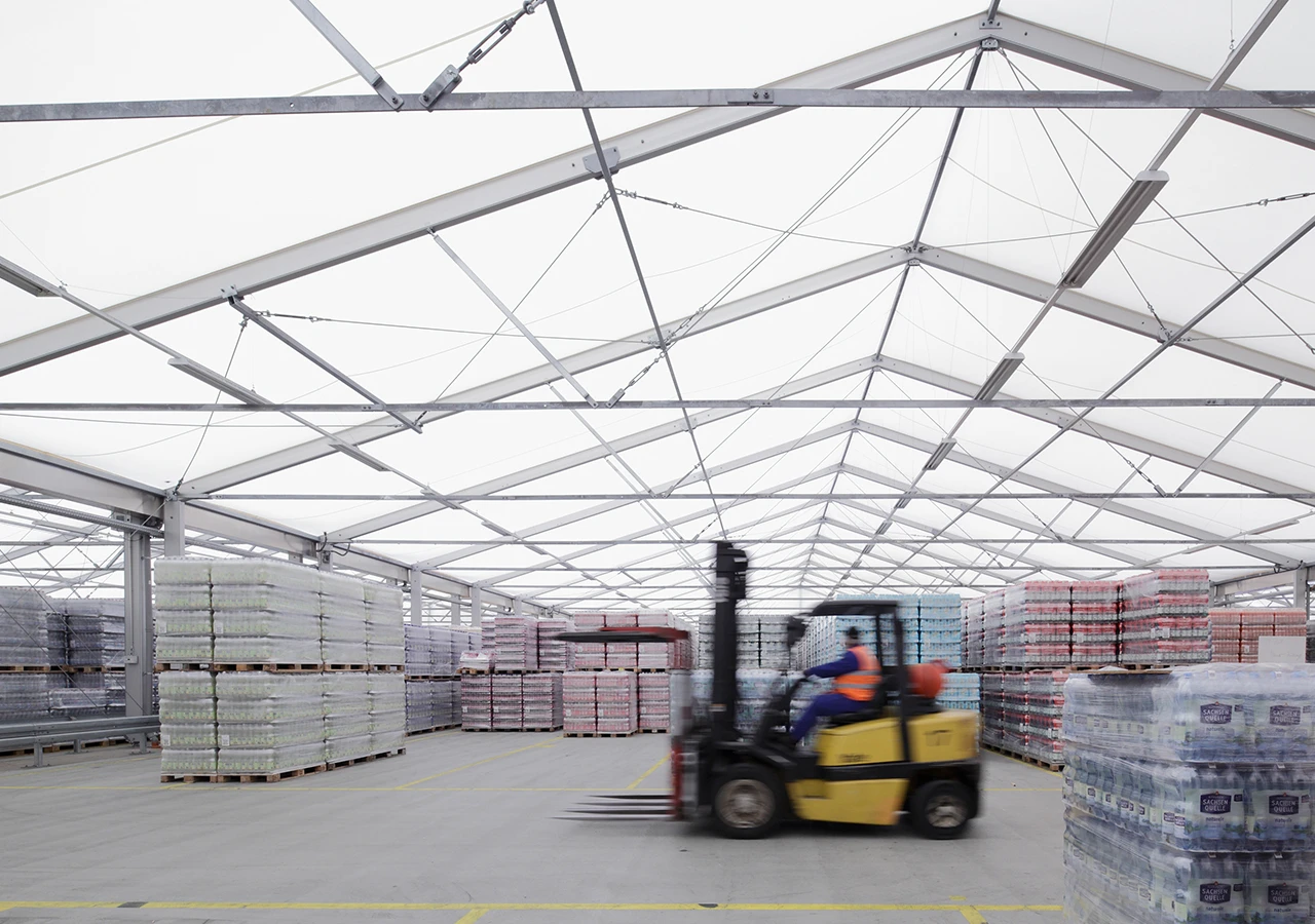 Covering a total area of 8,100 m², the tent is fully integrated into Franken Brunnen's production and logistics processes, both in terms of its size and operational solutions. Loading ramps streamline on-site flow, and the expandable modular system provides an infrastructure ready for future growth.