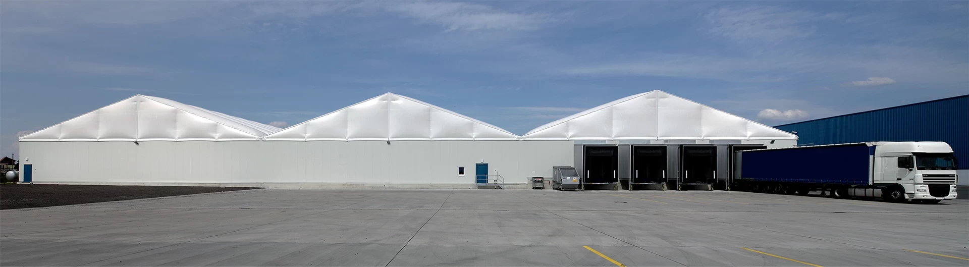 In the production facilities of Franken Brunnen, Germany's largest packaged water producer, 3 pieces of 30 meters wide and 90 meters long H-Line Series were used. The Thermo-Roof roof system, which provides 50% savings in heating and cooling costs compared to single-layer canvas structures, has been applied in the building. Fast opening doors and loading ramps are positioned in line with the needs.