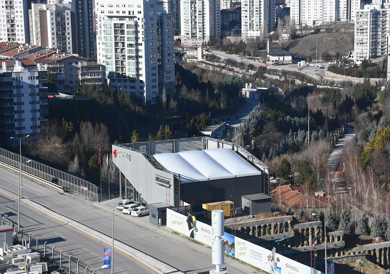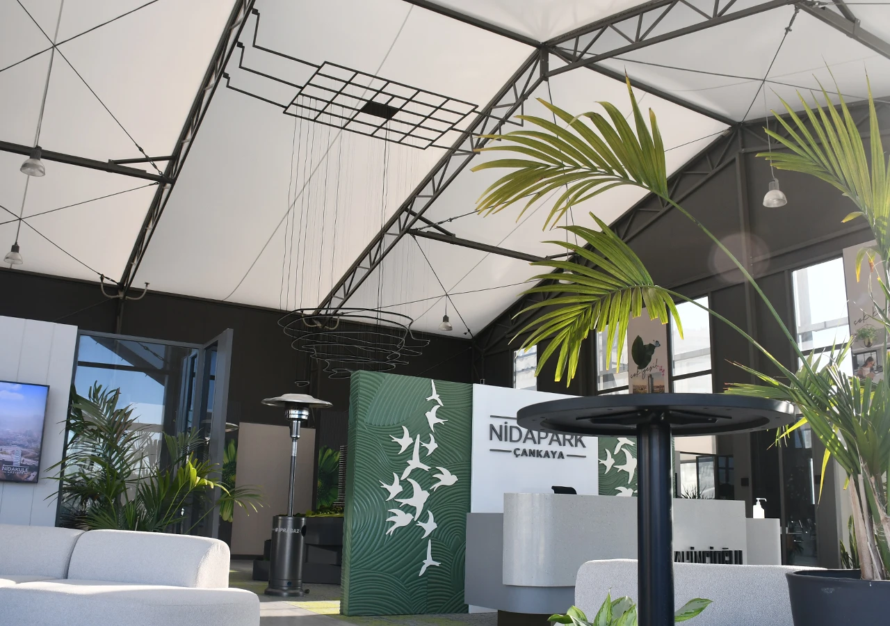 A T-Line series sales office tent, designed to reflect the brand's corporate identity, was constructed for Tahincioğlu's prestigious Ankara project. The structure was designed with a focus on both architectural aesthetics and functionality, and the interior use was optimized to enhance the customer experience. The project included integrated office partitions and reception areas, creating a comfortable and stylish structure.